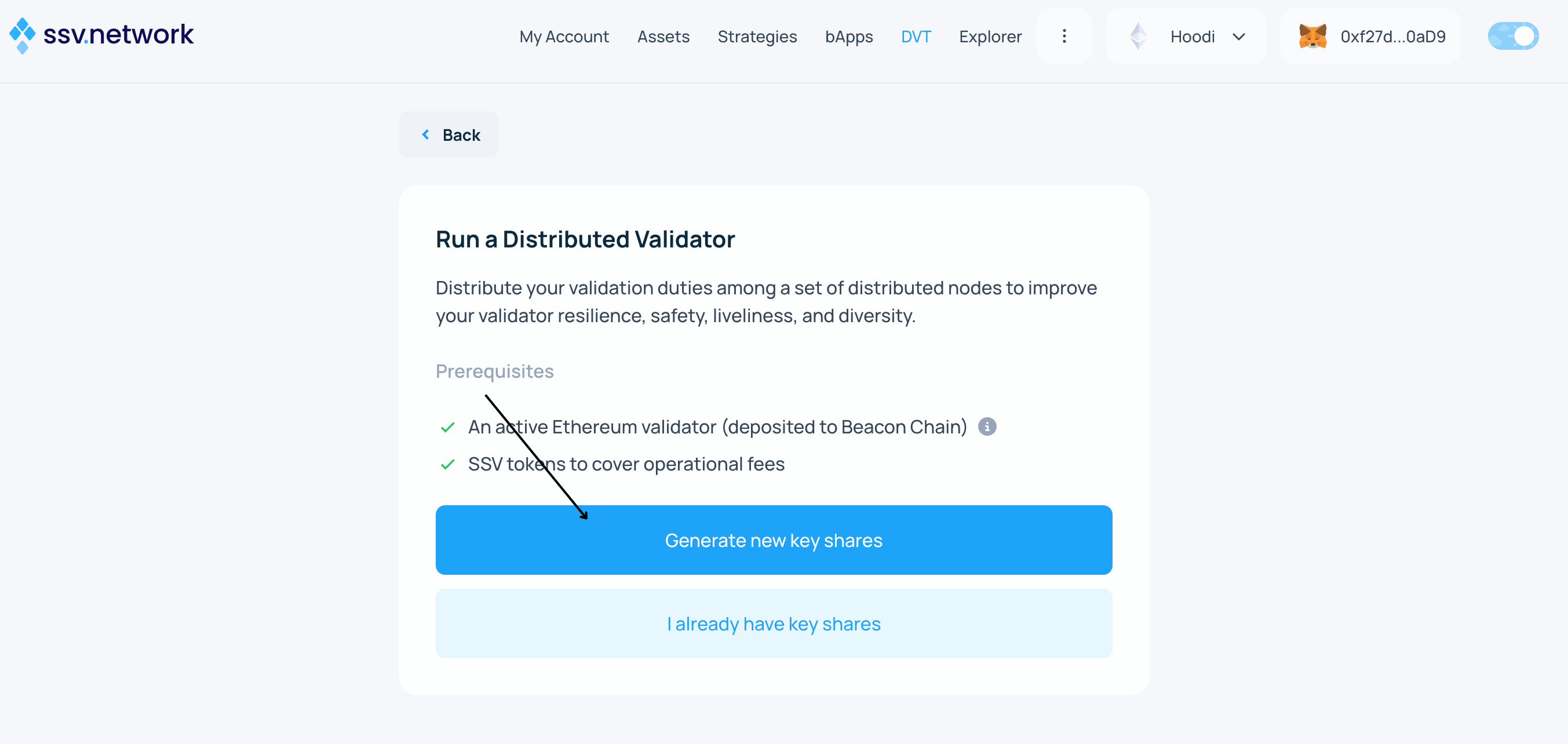 SSV Network β is a permissionless DVT network that provides a simple infrastructure for splitting and distributing a validator key into multiple key shares to run a validator across multiple non-trusting nodes.
