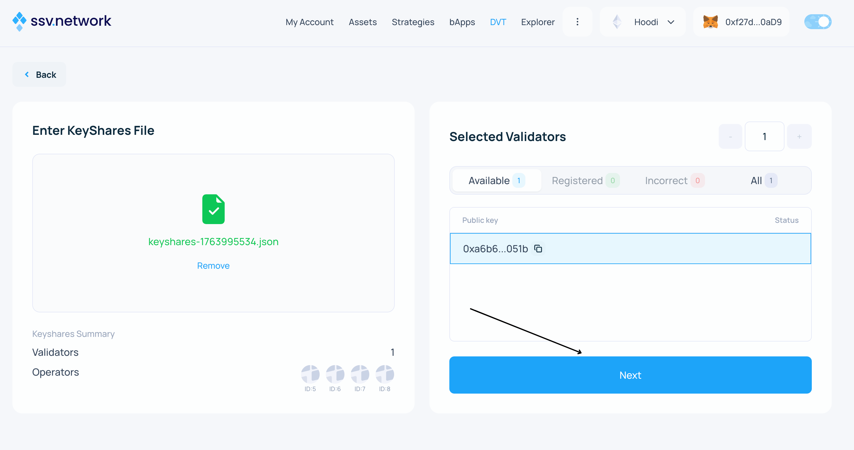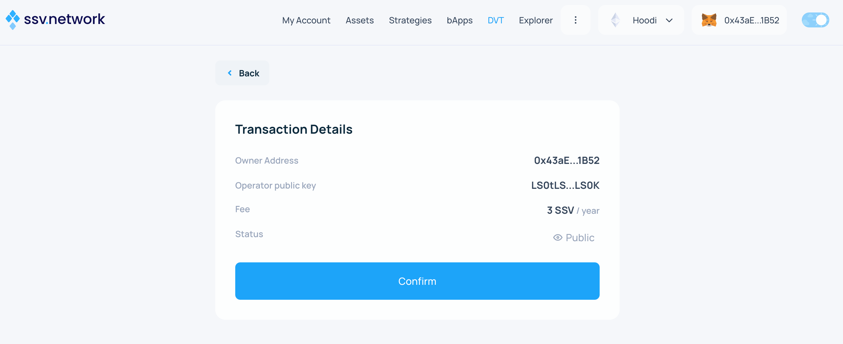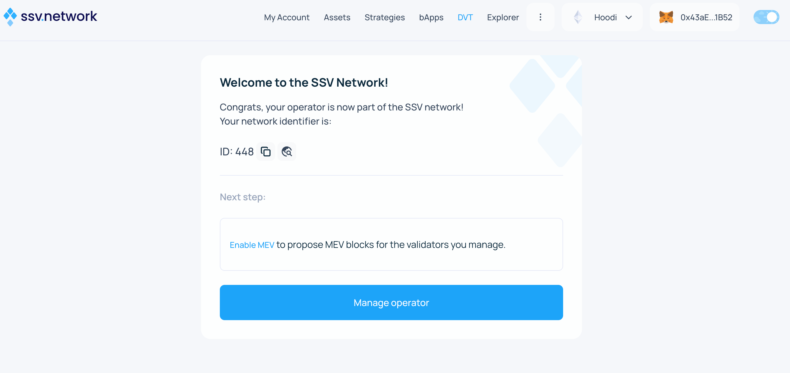 - Congratulations! π Your validator is now registered on the SSV network and being managed by your selected operators.