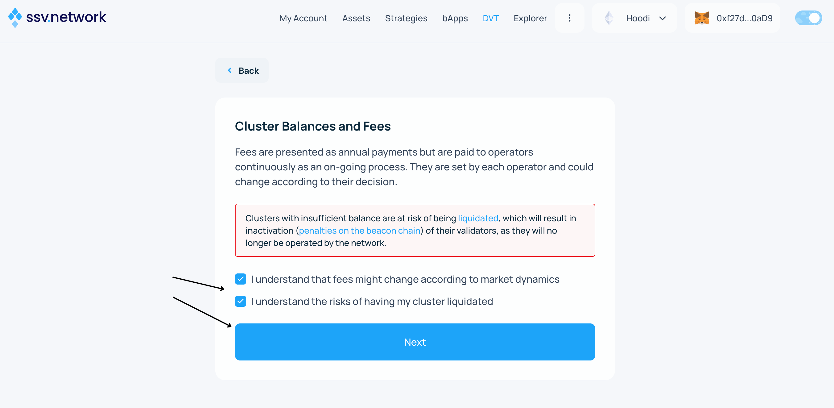Understand how fees are managed β and keep your cluster balance above the Liquidation Collateral threshold. If liquidated, your validators will stop being operated, which could lead to penalties on the Beacon Chain. Learn more β
