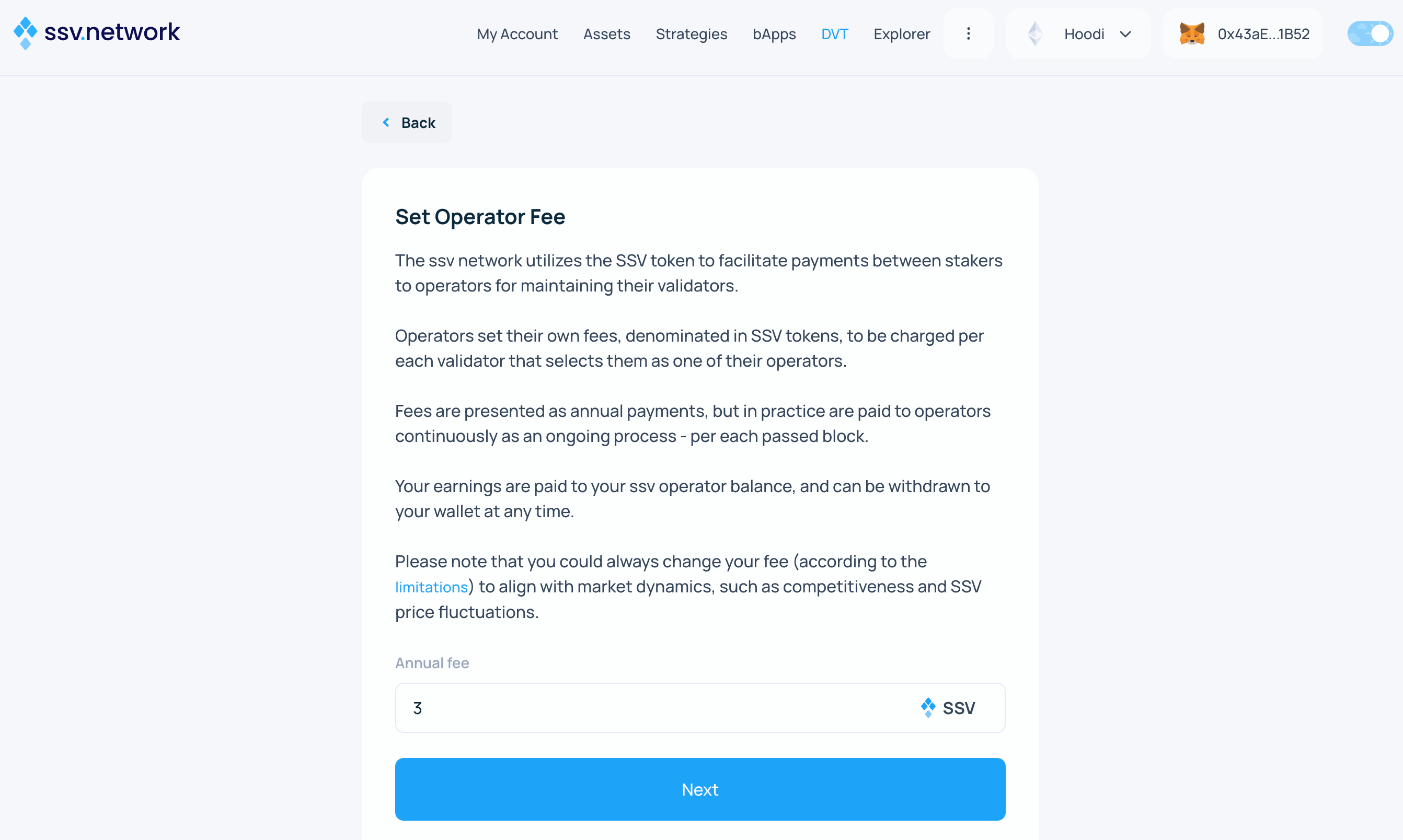 Your fee (in SSV tokens) is charged per validator that selects you. Earnings accumulate in your balance and can be withdrawn anytime. You can update your fee laterβdecreases take effect immediately, increases require a waiting period to protect stakers β.